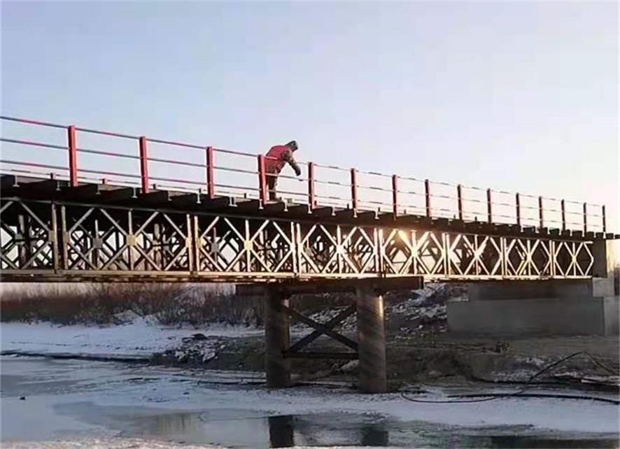 近段時(shí)間,鋼便橋施工地點(diǎn)黑龍江省五常市的氣溫低至零下25攝氏度左右。這樣的低溫下,河中結(jié)起了50公分的冰層,施工便道也變得異常的滑,不能按常規(guī)的工序施工。經(jīng)公司施工部門商議,首先采用磨冰鉆洞機(jī)進(jìn)行冰層開孔,同時(shí)對(duì)路面采取防滑處理,然后再振樁。一來解決了施工防滑問題,二來冰層取孔后能更好的進(jìn)行鋼管柱的植入。