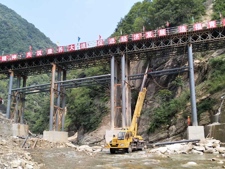 2018年,廣元青川縣遇到了百年一遇的洪水,鋼便橋所處的河道水位也淹沒了整條縣道,該地域已有多座鋼便橋被沖毀。我公司所施工的鋼便橋經(jīng)歷了洪水的洗禮,屹立不倒,為廣平高速正常施工,保證了其重要輸送通道。